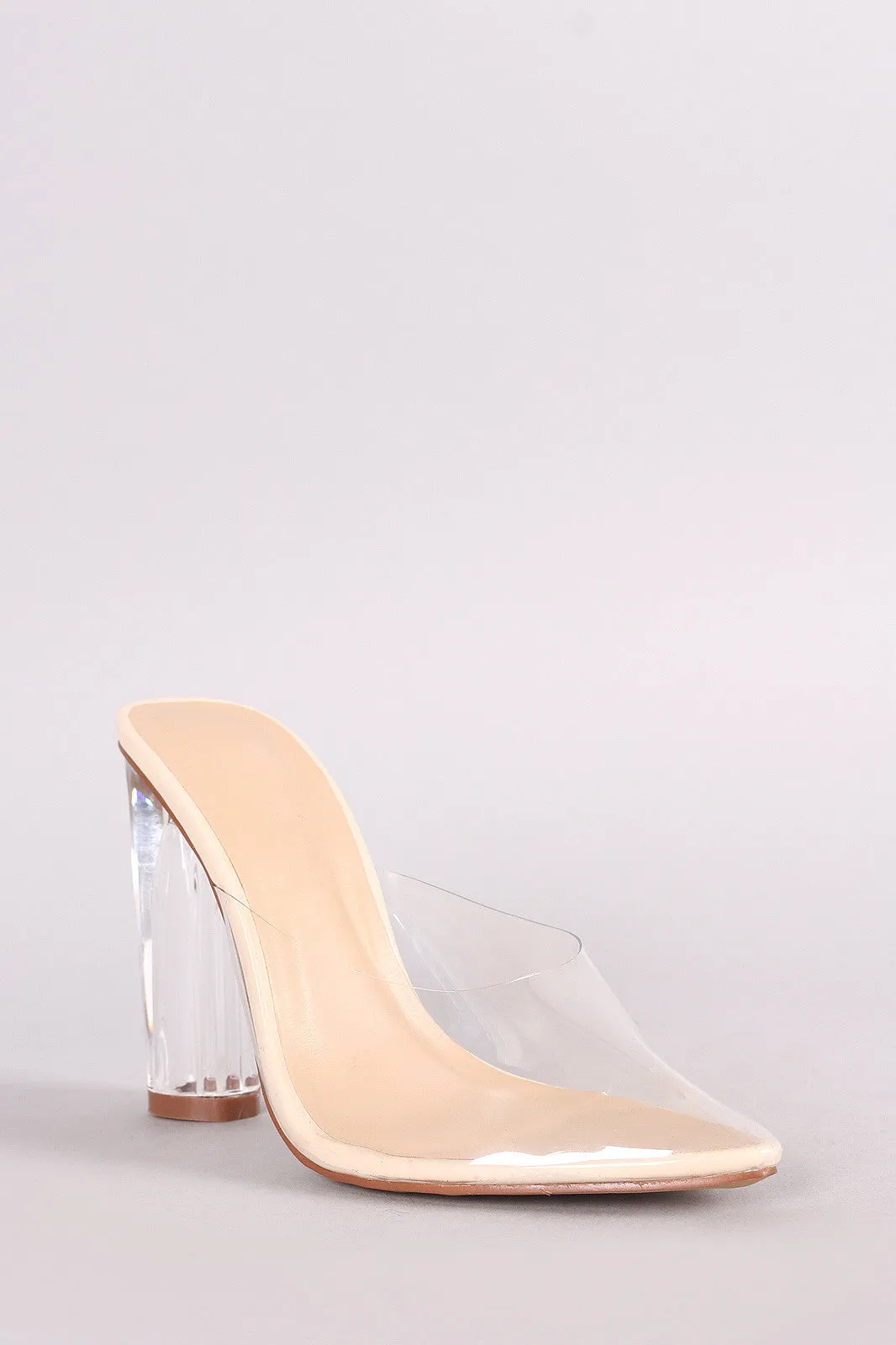 This trendy mule features a pointy toe silhouette, transparent design vamp, chunky perspex heel, and lightly padded insole. Easy slip-on style.